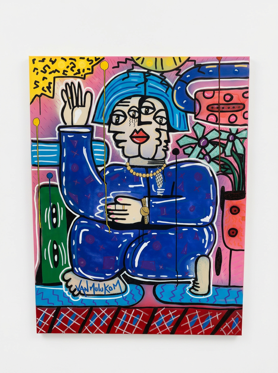 Le fond rose et jaune vif, animé de motifs graphiques et de formes géométriques caractéristiques de l’univers Van Mulukom, crée une atmosphère festive et dynamique. Les tons bleu cobalt, rose fuchsia et jaune soleil se répondent dans un équilibre coloré parfaitement maîtrisé. Ce tableau pop art original mêle influences cubistes et énergie street art dans une composition à la fois structurée et explosive. Chaque détail — les motifs du vêtement, les accessoires, les éléments de fond — raconte une histoire visuelle dense et généreuse.