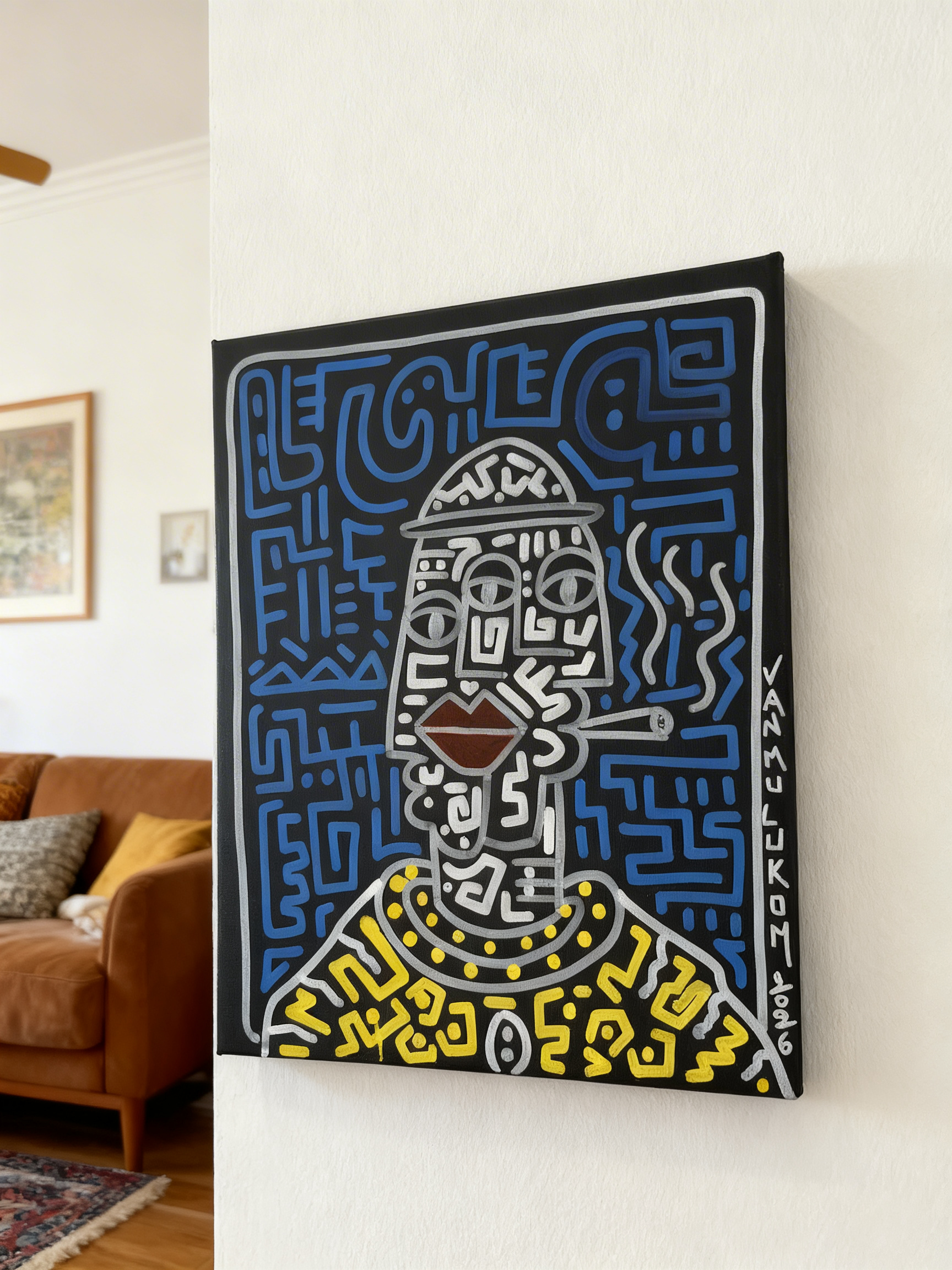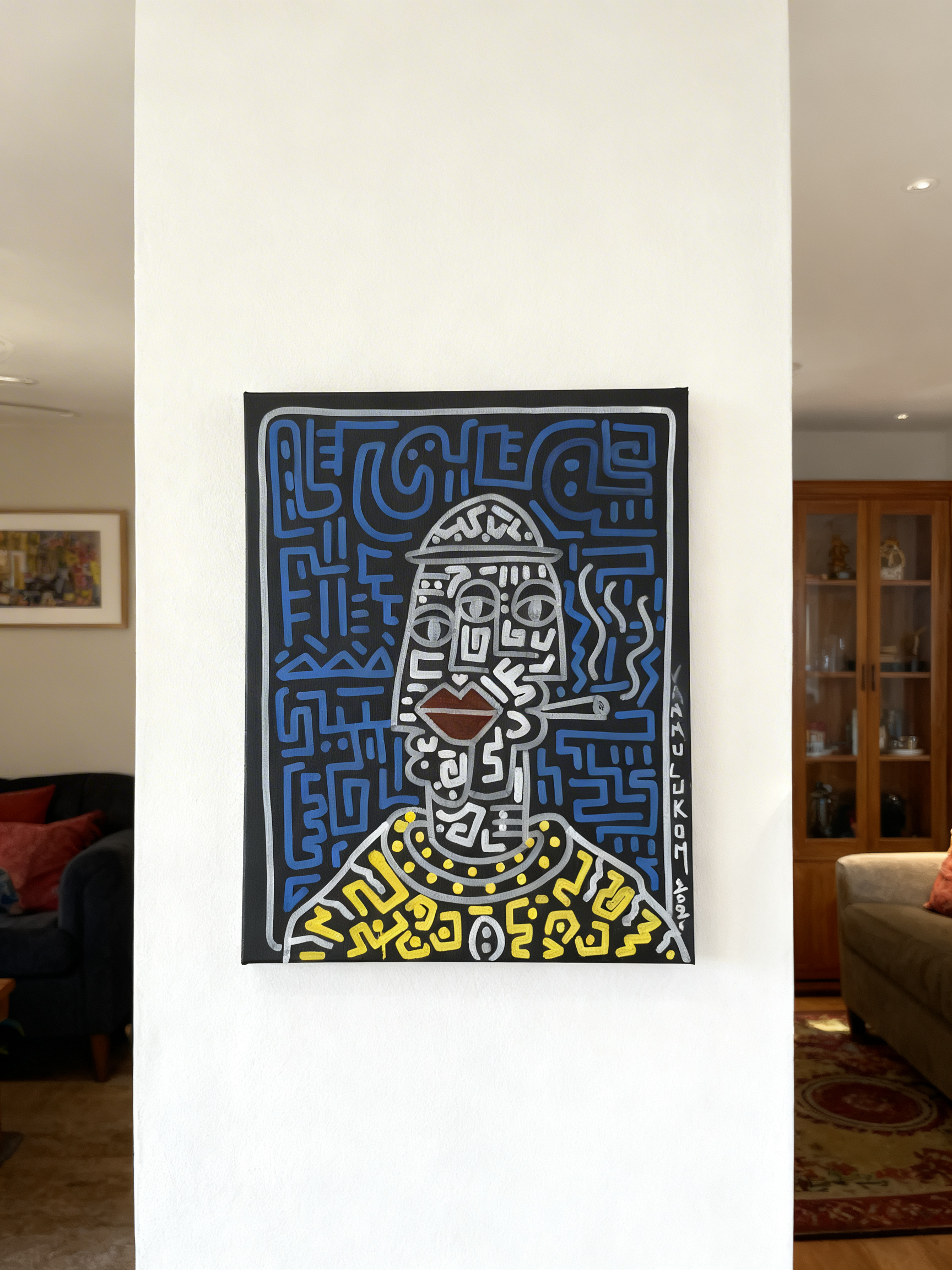La cigarette tenue en bouche et les volutes de fumée ajoutent une dimension narrative forte à cette composition nocturne. Les traits bleus électriques sur fond sombre, les symboles répétés et la densité graphique de cette peinture acrylique originale lui confèrent un caractère urbain et mystérieux à mi-chemin entre le street art et l’art tribal contemporain. Chaque ligne trace une histoire, chaque symbole ouvre une interprétation.