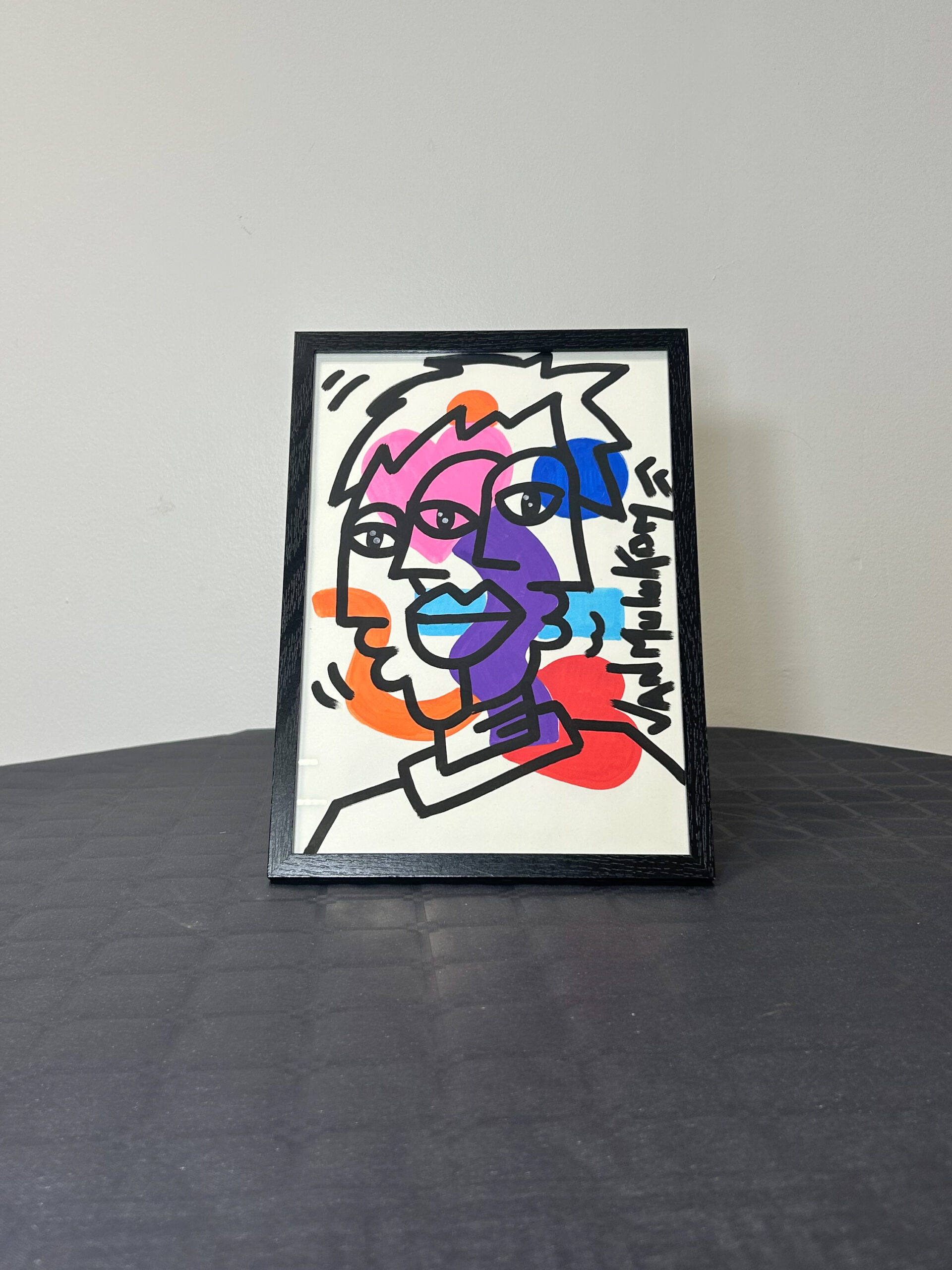 Les lignes noires épaisses structurent l’œuvre tandis que les aplats de rose, violet, bleu et orange créent un contraste fort et contemporain.