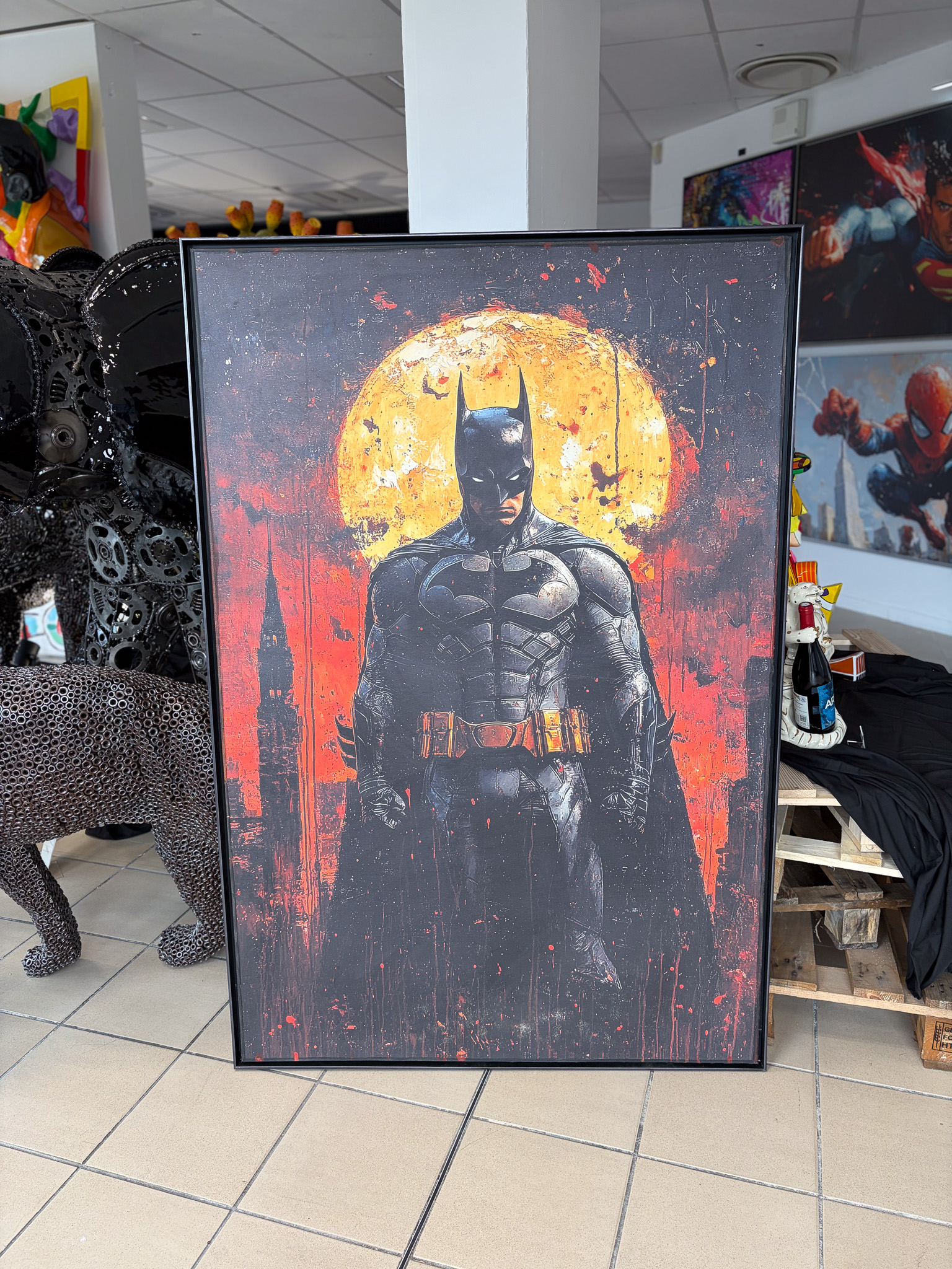 Ce tableau Batman Red au format 150 × 100 cm présente une illustration puissante du personnage, mis en avant devant une grande lune rouge texturée. Le contraste entre le rouge vif de l’arrière-plan et la silhouette sombre du costume crée une œuvre visuelle forte et contemporaine.