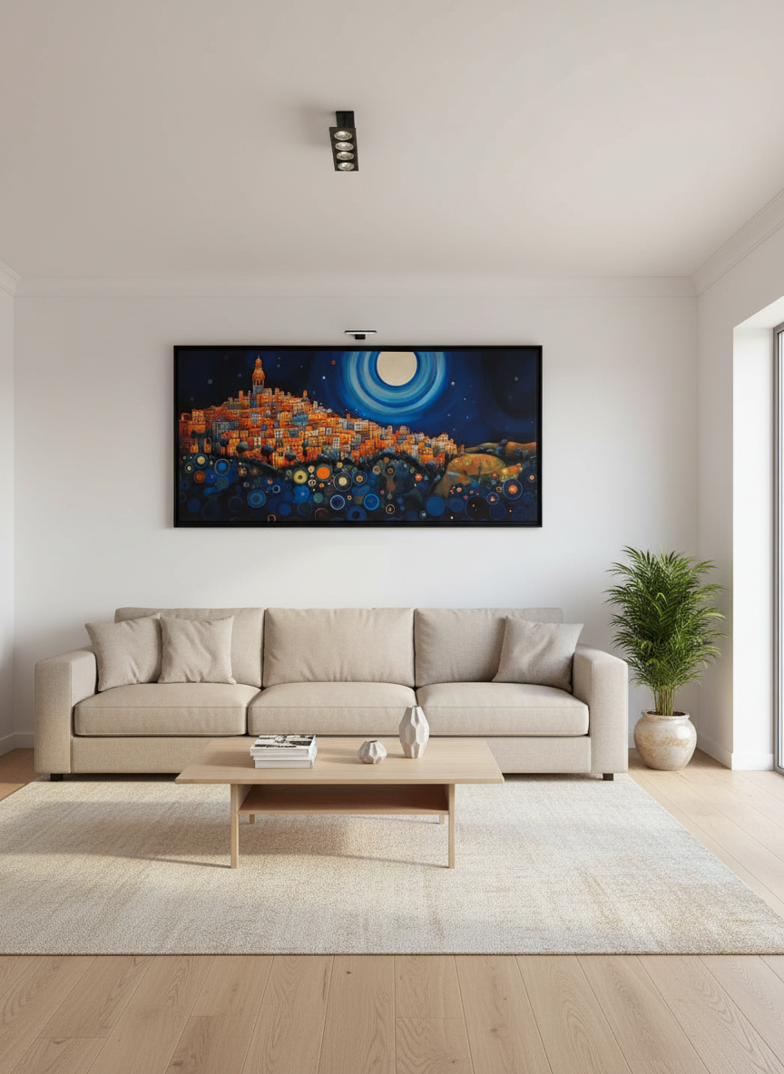 Ce tableau Ville Nocturne au format panoramique 100 × 200 cm offre une scène poétique et contemporaine d’une cité lumineuse sous un vaste ciel étoilé. Les couleurs vibrantes, les formes géométriques circulaires et les nuances profondes de bleu créent une composition hypnotique, à la fois moderne, chaleureuse et artistique.