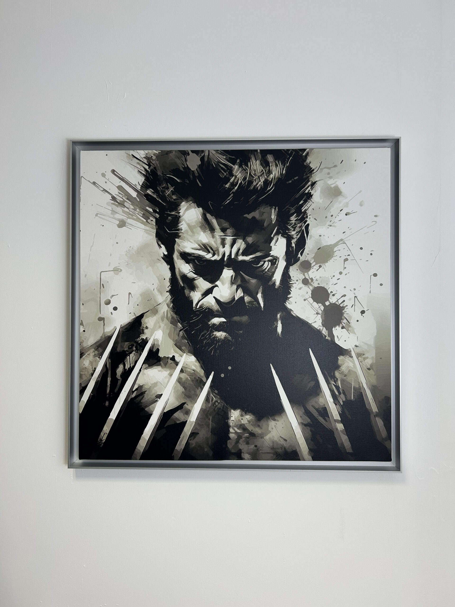 Ce tableau de 70 × 70 cm met en scène Wolverine dans une interprétation artistique puissante en noir & blanc. Le travail graphique fait ressortir l’intensité du personnage grâce à des contrastes marqués, des projections d’encre et une composition énergique qui attire immédiatement le regard.
