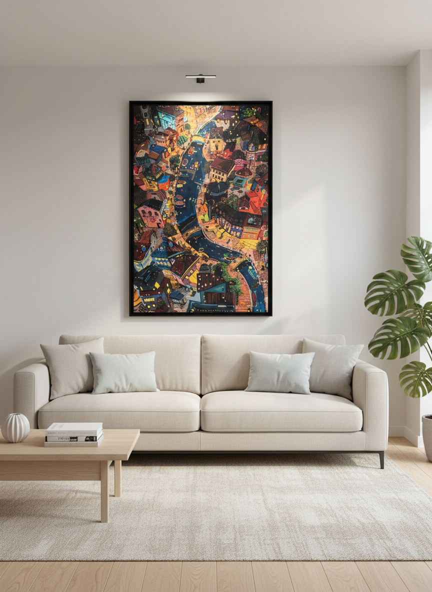 Découvrez une pièce véritablement unique, disponible en un seul exemplaire. Cette œuvre de 150 × 100 cm, imprimée sur une toile premium, met en scène un dessin exclusif représentant une ville illuminée vue du dessus : ruelles vivantes, couleurs vibrantes, détails minutieux… Chaque élément de l’illustration est riche, précis, et totalement singulier.